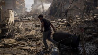 A man pulls a drum at the site of an Israeli strike in Tyre, Lebanon, April 8, 2026. REUTERS/Adnan Abidi TPX IMAGES OF THE DAY