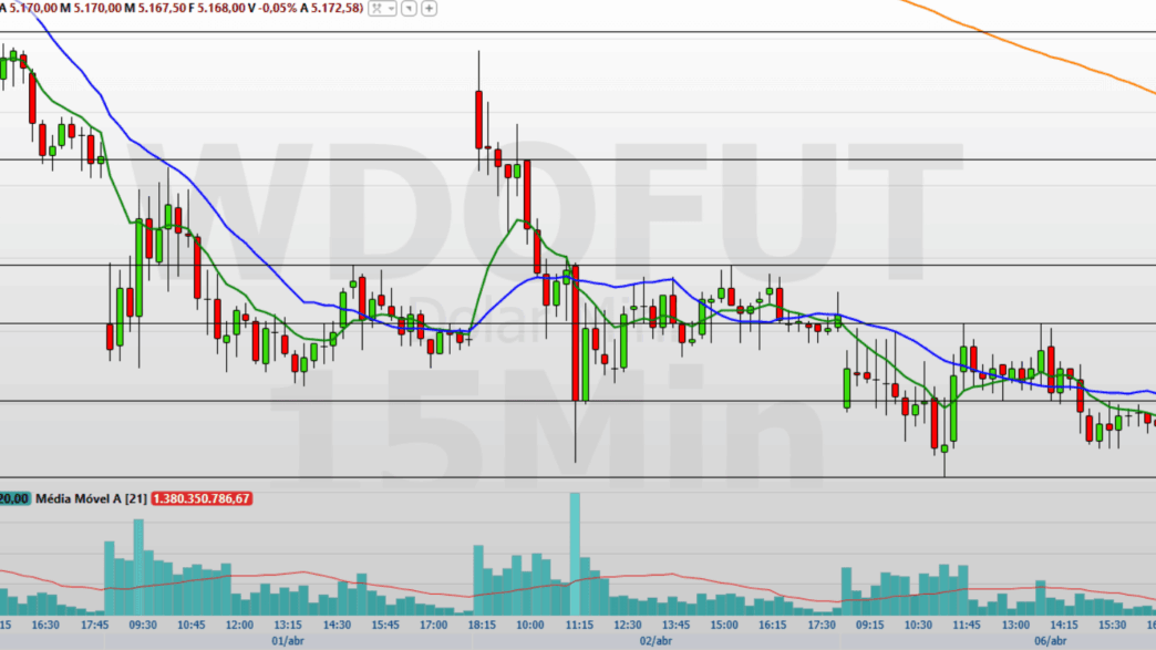 No gráfico de 15 minutos, observo que o minidólar fechou em baixa, retomando o fluxo vendedor e negociando abaixo das médias móveis de 9 e 21 períodos, o que mantém a pressão negativa no curto prazo.