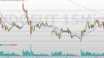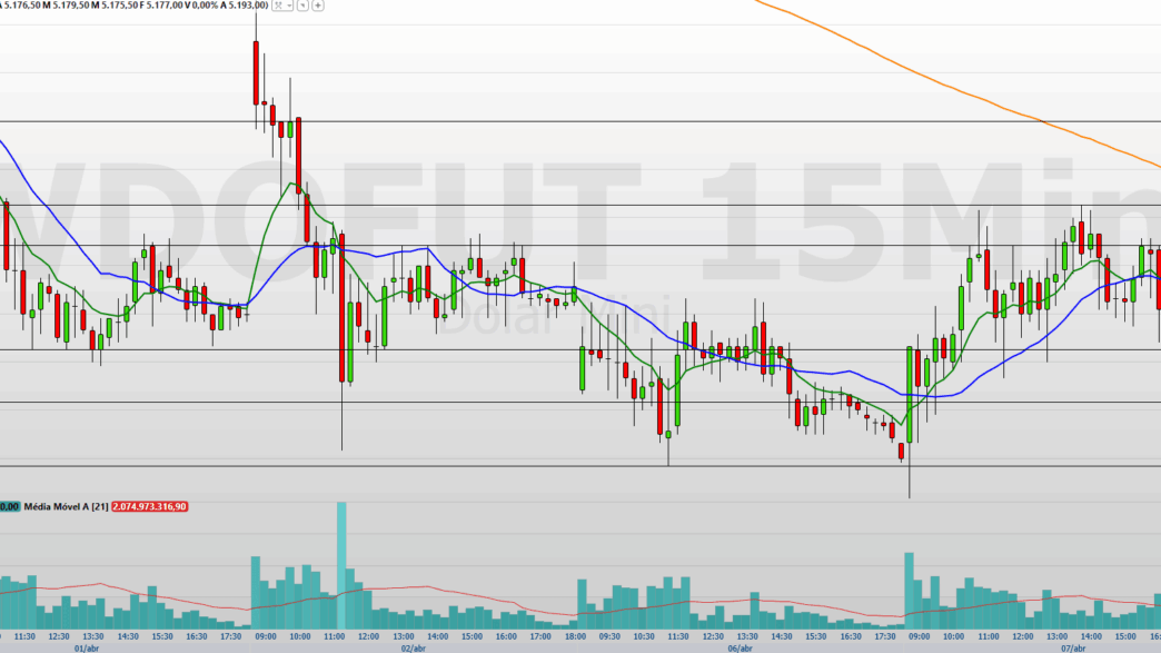 No gráfico de 15 minutos, o minidólar fechou em alta, mas devolveu parte do movimento no fim da sessão, encerrando abaixo das médias móveis de 9 e 21 períodos, um sinal de perda de força compradora no curtíssimo prazo.